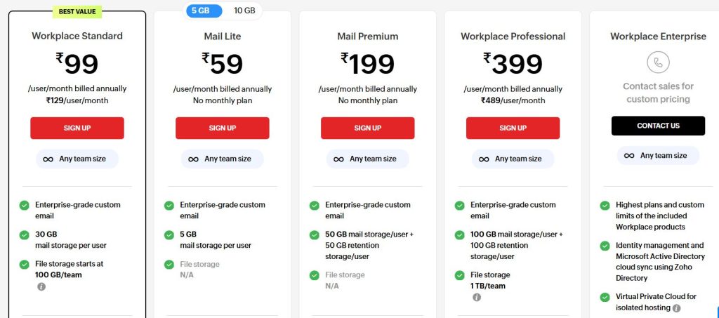 Zoho Workplace is known for its affordability without compromising essential business functions. It includes ample storage, intuitive email controls, spam filtering, calendaring, and file sharing.